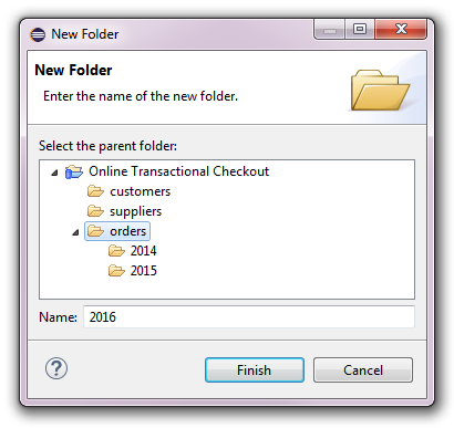 A new folder can be created by opening the context menu on a checkout or on an existing folder under a checkout and then selecting New -> Folder. The following dialog will pop up to ask for the name of the new folder: