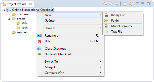 New resource nodes can be created directly in the Project Explorer by opening the context menu on a checkout or on an existing folder under a checkout and then opening the New sub menu: