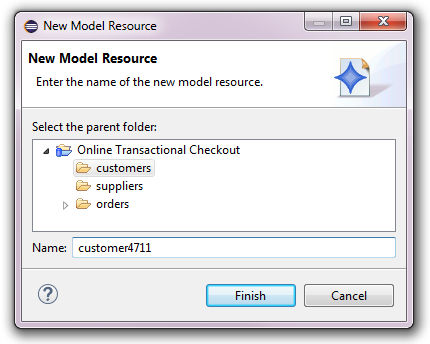 A new model resource can be created by opening the context menu on a checkout or on an existing folder under a checkout and then selecting New -> Model Resource. The following dialog will pop up to ask for the name of the new model resource: