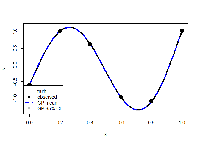legend("bottomleft", legend = c("truth", "observed", "GP mean", "GP 95% CI"),