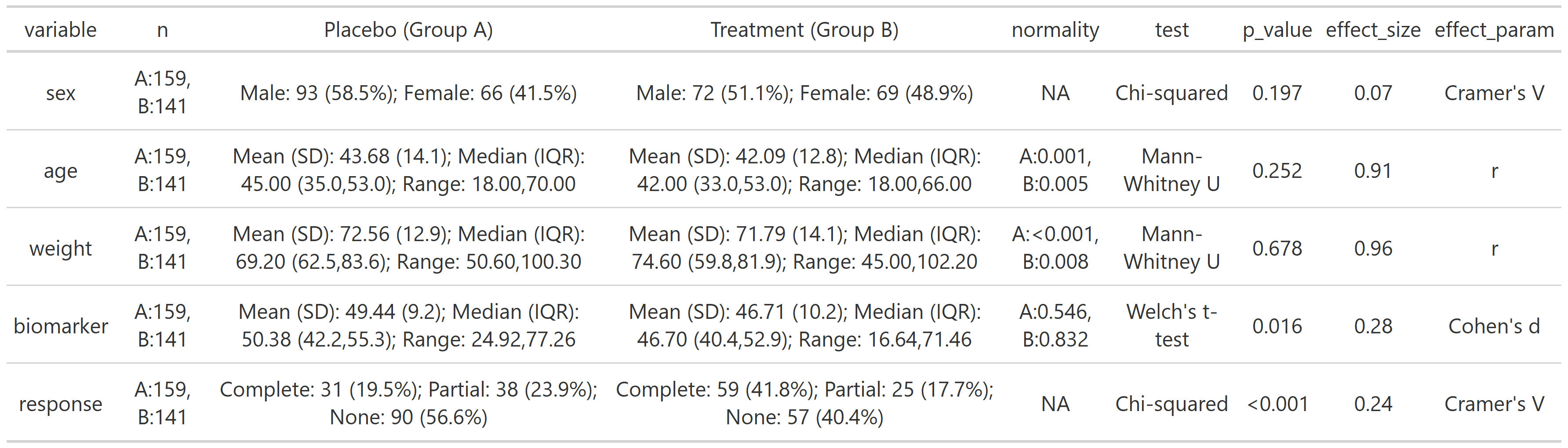 summary_table(clinical_df, group_by = 'treatment', exclude = c('subject_id', 'visit'))