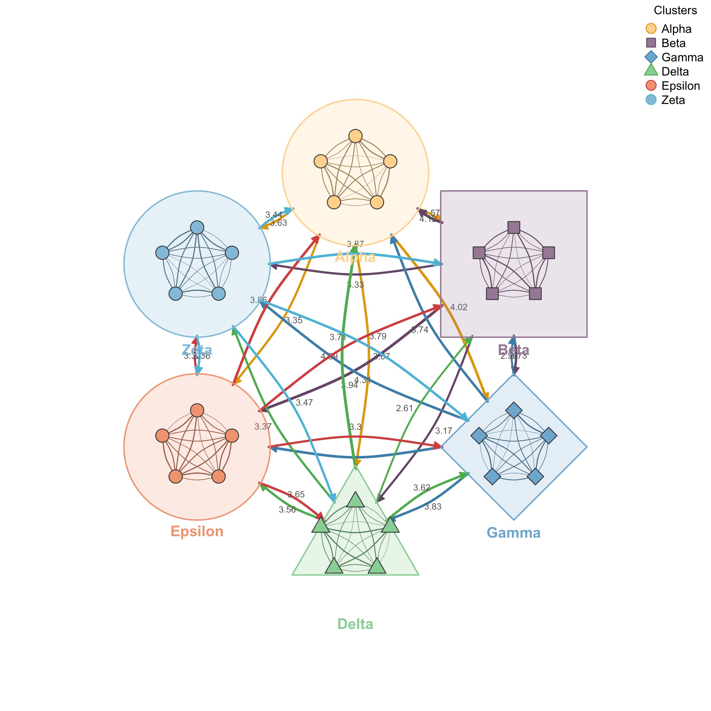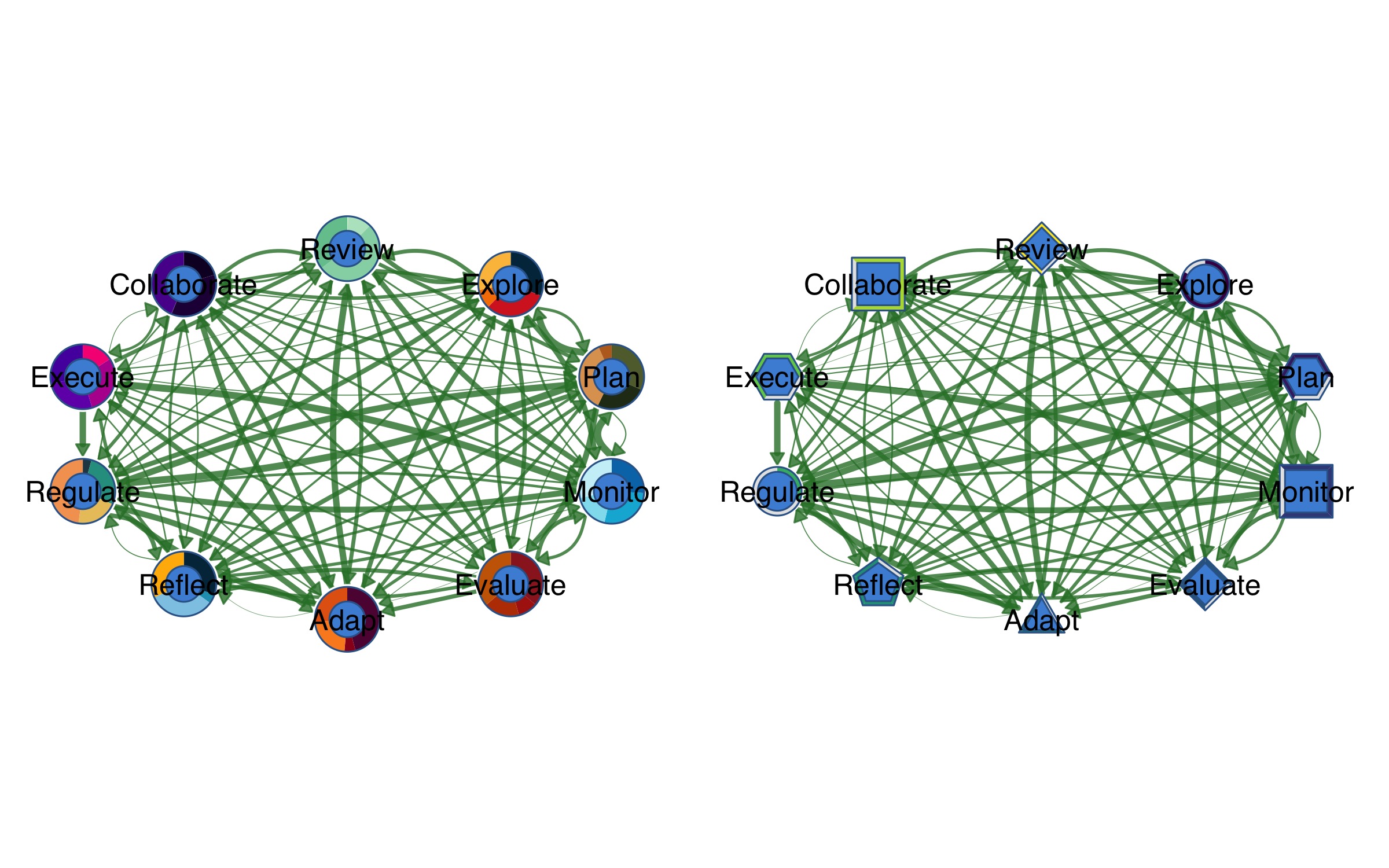 Key parameters: * spacing: Distance between cluster centers * shape_size: Size of cluster shells * node_spacing: Node placement within shapes (0-1) * shapes: Vector of shapes per cluster (“circle”, “square”, “diamond”, “triangle”) * summary_edges: Show aggregated between-cluster edges (default TRUE) * within_edges: Show individual within-cluster edges (default TRUE)